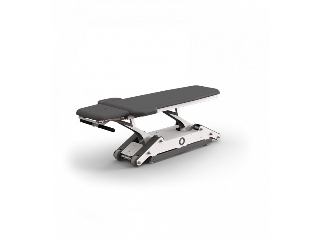 Elektrický 2dílný osteopatický stůl s bočními sklopnými područkami. Nastavitelná hlavová část v kladných a záporných úhlech pro cervikální ošetření a speciální šířka 55 cm. Ve srovnání s jinými modely umožňuje jeho speciální úzká šířka osteopatovi zůstat během léčby blízko pacienta. Stůl je vybaven 1 motorem, který ovládá výšku stolu pomocí obvodového nožního spínače umístěného na základně stolu.