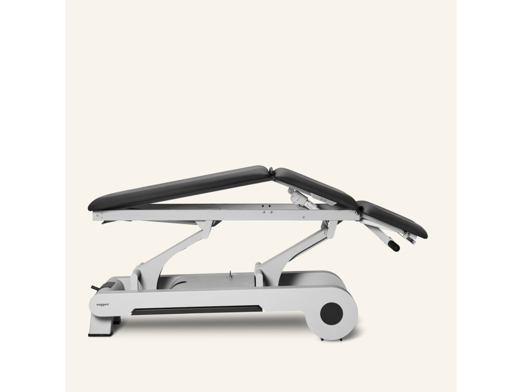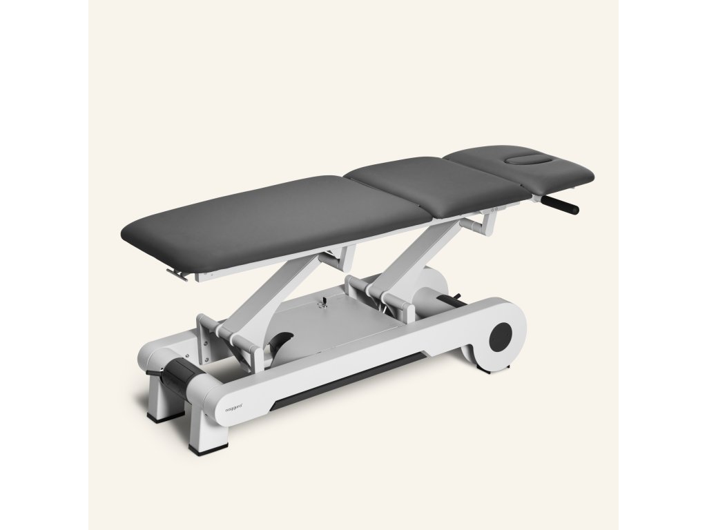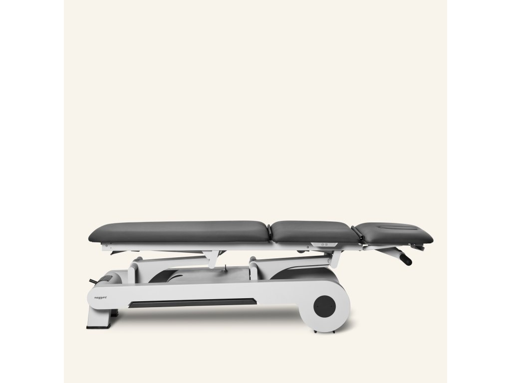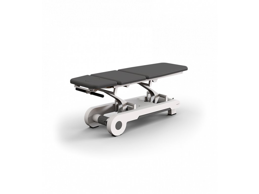 Elektrický třídílný ošetřovací stůl, který lze nastavit do více poloh, což poskytuje optimální flexibilitu a pohodlí. Stůl je vybaven 2 motory: první ovládá výšku stolu a druhý nastavuje střední část (kyfózu). 3 sekce umožňují Trendelenburgovu pozici, kyfózu pro ošetření spodní části zad a masážní křeslo. Výška stolu se ovládá obvodovým nožním spínačem umístěným u paty stolu a střední část se nastavuje tlačítkovou skříňkou umístěnou na jedné straně rámu stolu.