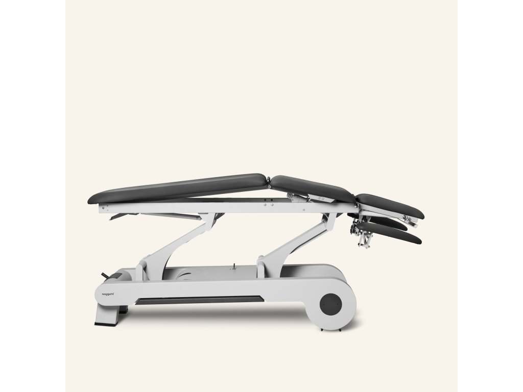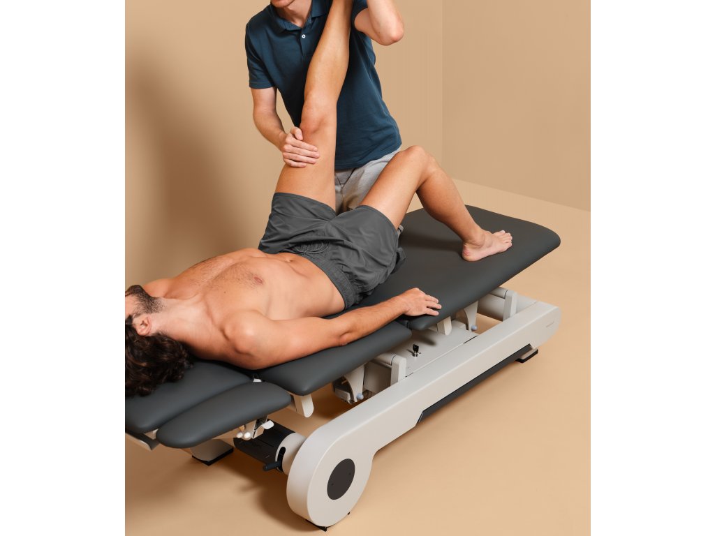 5sekční terapeutický stůl vybavený 2 motory. Elektrické ovládání výšky pomocí obvodového nožního spínače a poloha elektrického odvodnění nastavitelná tlačítky na horním rámu. Vybaveno systémem TwinLift: pacient si může nastavit područky, aby snížil napětí a uvolnil ramenní pletenec během ošetření. 4 kola otočná o 360°.