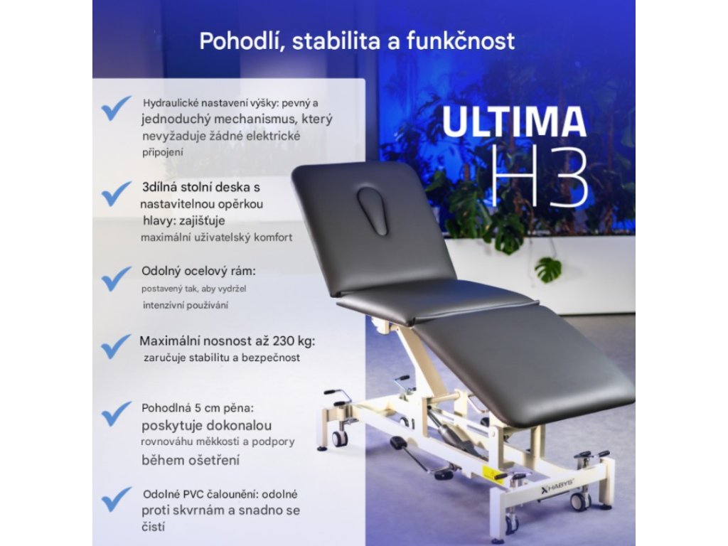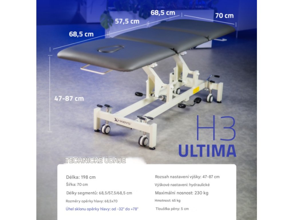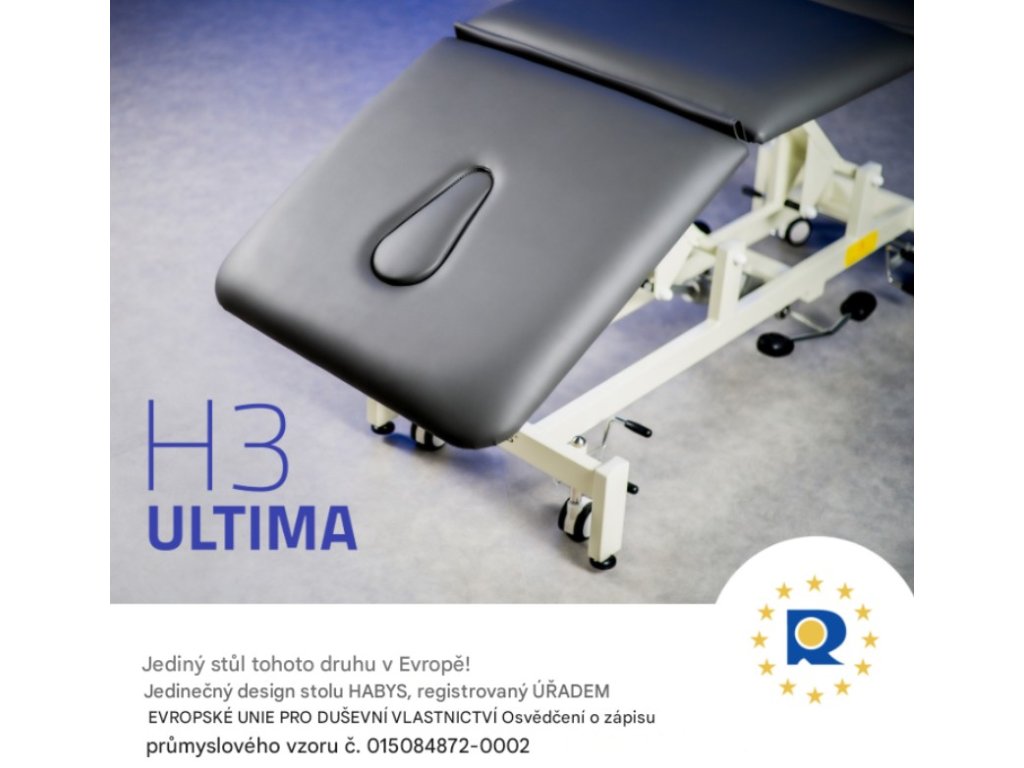 Terapeutický stůl Ultima H3, vybavený třídílnou deskou, je určen pro profesionální použití ve fyzioterapii, masážích a rehabilitaci. Byl vytvořen s cílem poskytnout terapeutovi ergonomii a snadné použití. Odolná konstrukce a funkční vlastnosti stolu zaručují stabilitu a bezpečnost během ošetření. Masážní stůl Ultima H3 je výjimečně pohodlný pro každodenní použití, díky čemuž je vysoce ceněn pacienty i terapeuty. Tabulka je registrována a certifikována CE podle nařízení o zdravotnických prostředcích (MDR) 2017/745/EU.