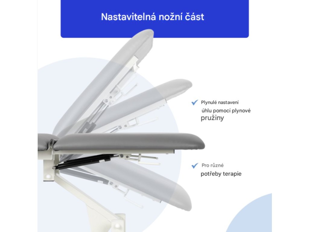 - Nastavitelná část nohavic: Úhel části nohou lze nastavit pomocí plynové pružiny, takže je ideální pro manuální terapii, ošetření dolních končetin a rehabilitaci po zranění.