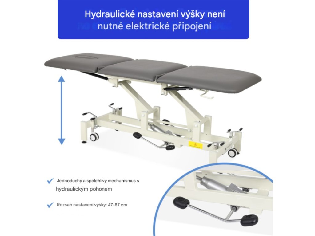 - Certifikovaný hydraulický pohon: Mechanismus nastavení výšky umístěný na obou stranách stolu umožňuje plynulé nastavení v rozsahu 47–87 cm. Tato funkce zajišťuje ergonomii práce terapeuta a pohodlí pacienta bez nutnosti elektrického připojení.