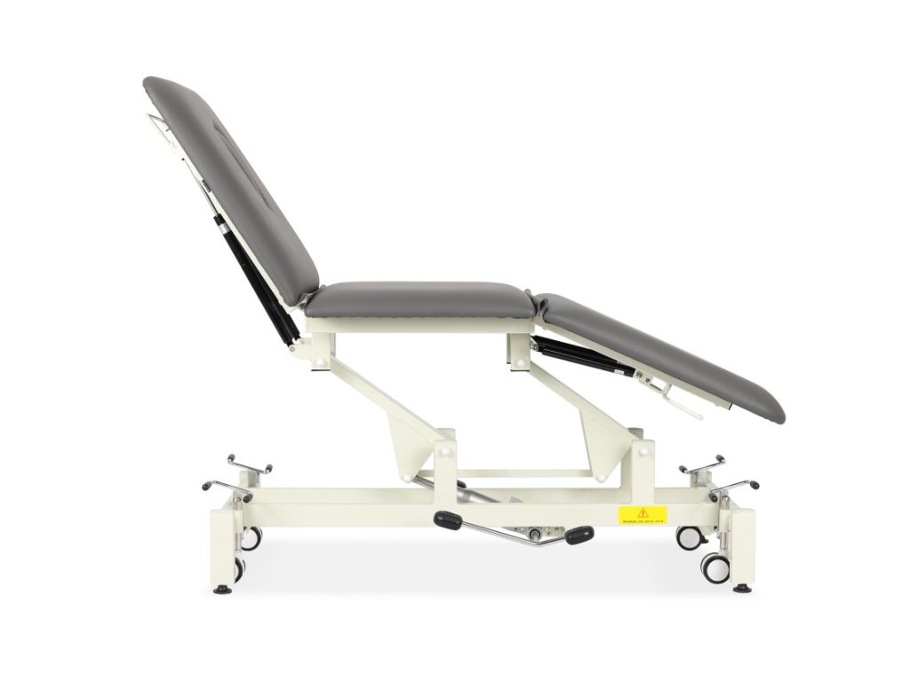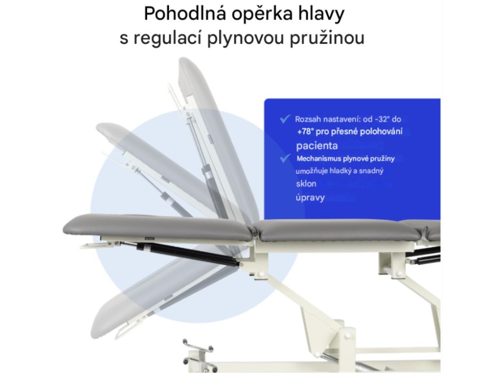 - 3dílná stolní deska: Horní část o rozměrech 198 x 70 cm s nastavitelnou částí nohou a opěrkou hlavy umožňuje polohování pacienta vhodné pro různé terapeutické procedury.