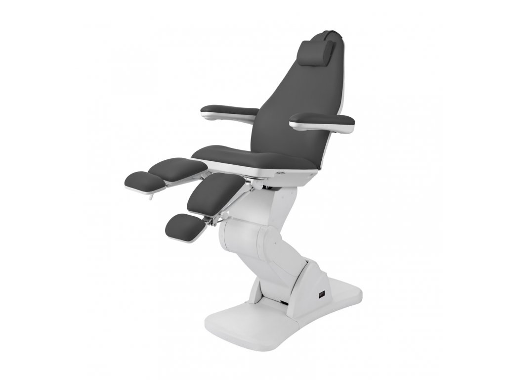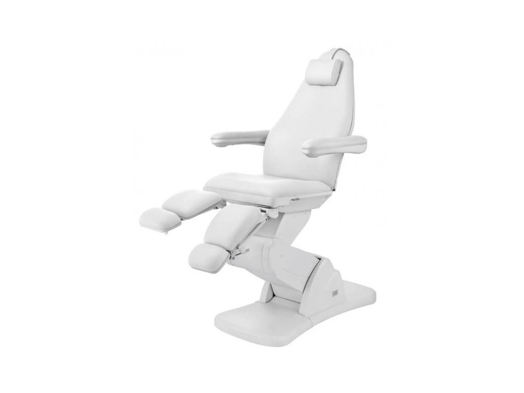 Luxusnější pedikérské křeslo s velmi stabilní základnou a vysokým komfortem. Speciální design, který umožňuje nastavení výšky. 5 motorů automaticky ovládají všechny pohyby (výška, opěradlo, podnožky a sedák). Nezávisle manuálně nastavitelné nohy zaručují optimální využití pro pedikúru. Reverzibilní ramena a nastavitelné opěrky hlavy. Bílá PU čalounění vysokou kvalitu a snadné čištění.