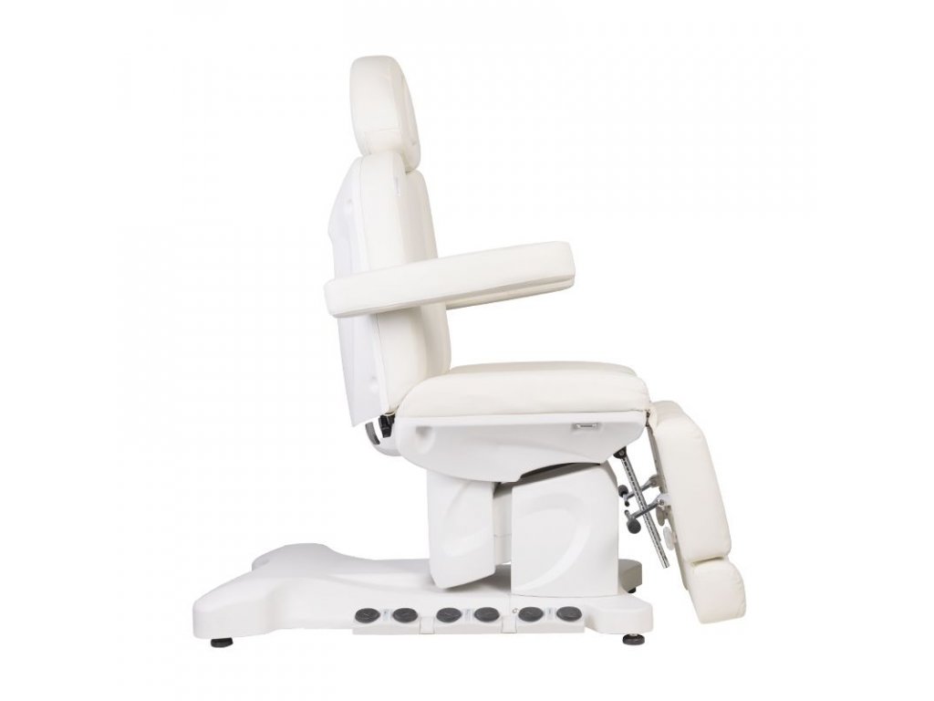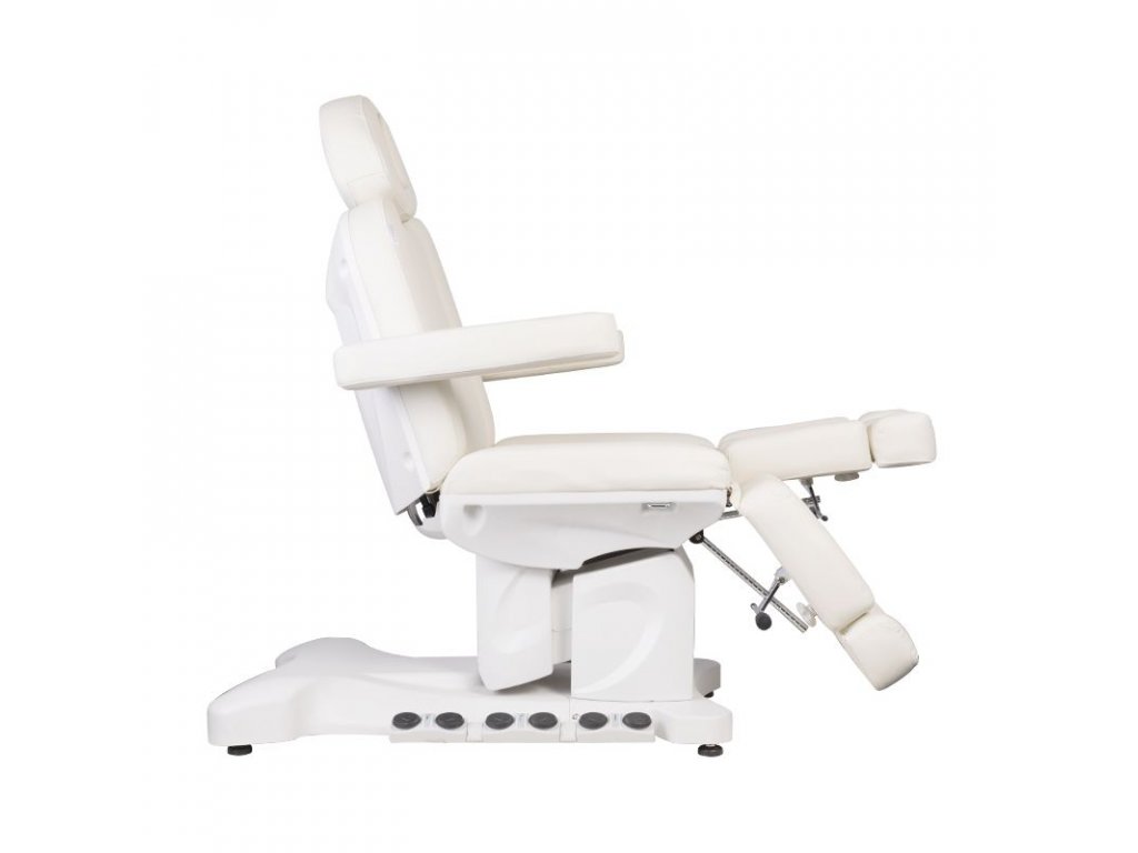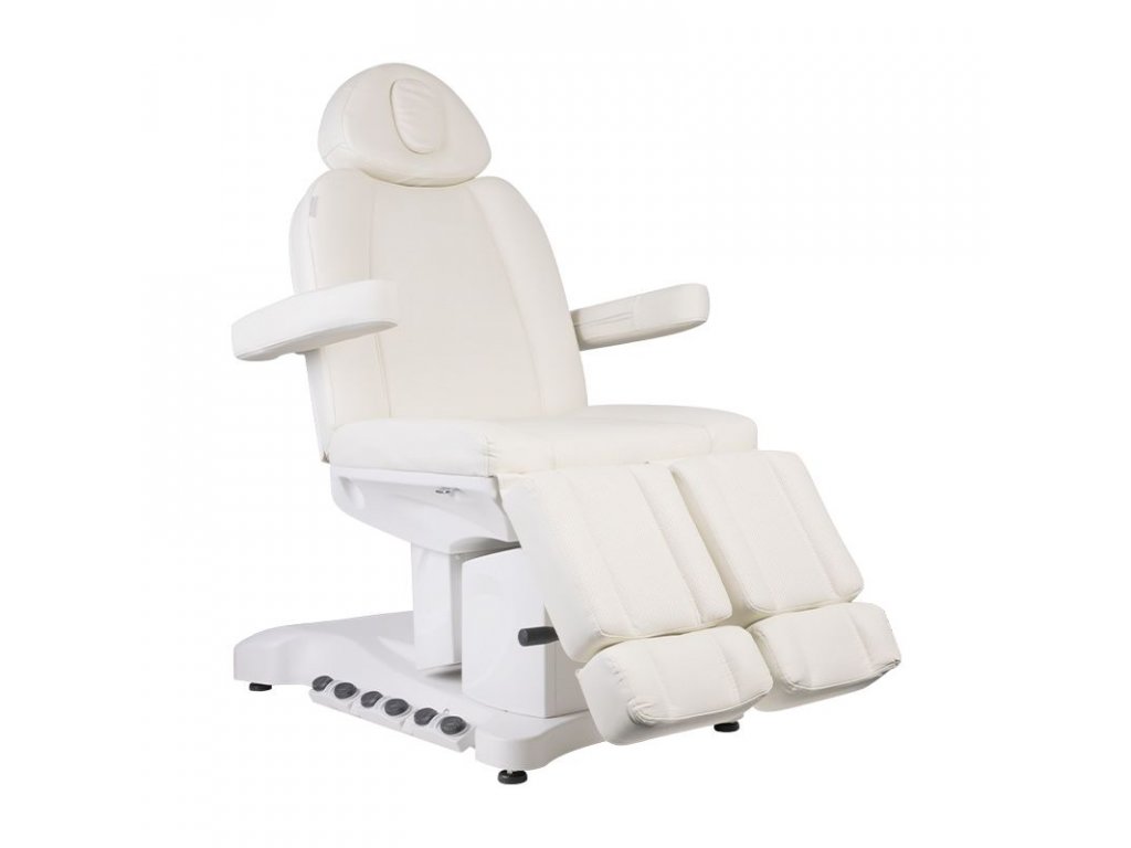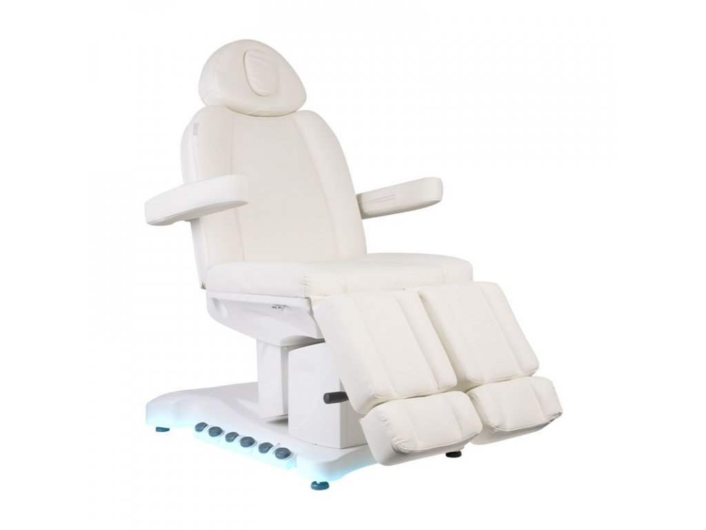 Jedinečné elektrické pedikérské křeslo ideální pro podiatrické salony a SPA salony. Díky nezávislým pohonům umožňuje nastavit křeslo ve 3 rovinách pomocí dálkového ovladače a nožních spínačů, což dává možnost pohodlné pedikúry, ošetření obličeje a těla. Pomocí dálkového ovladače můžeme použít naprogramované nastavení a spustit funkci HOT, tedy topení. Křeslo využívá perforované čalounění jedinečné u jiných křesel a barevné LED podsvícení podnože.