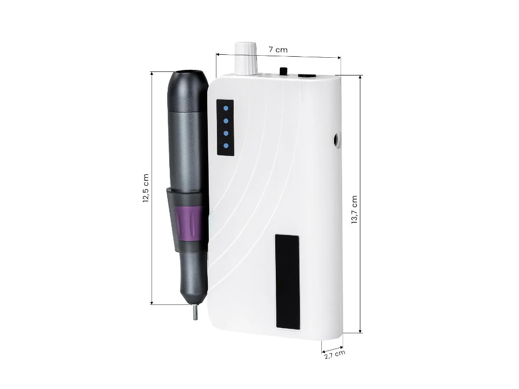 Akumulátorová manikúrní vrtačka 201 je malé a praktické zařízení, které je ideální pro práci mobilních nehtových stylistů a umožní vám pohodlně pracovat kdekoli. Výrazně usnadňuje odstranění zbytků předchozích stylizací a zlepšuje přípravu nehtů na další ošetření. Umožňuje pohodlný provoz až 10 hodin na jedno nabití.