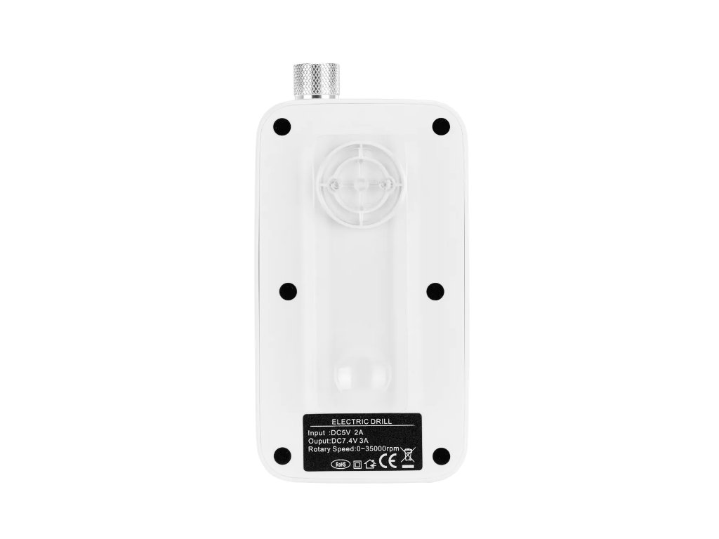 Frézka je praktická a lehká a její minimalistické plastové pouzdro v odstínech bílé zajišťuje odolnost a snadnou údržbu zařízení v čistotě. Díky kompaktním rozměrům a nízké hmotnosti lze zařízení snadno skladovat v malých prostorech a pohodlně přepravovat, což je důležité zejména pro poskytovatele mobilních služeb. Na zadní straně pouzdra je klip, který vám umožní pohodlně připevnit zařízení na opasek nebo jiné místo. Protiskluzové prvky na spodní straně zařízení navíc zajišťují větší stabilitu během používání.