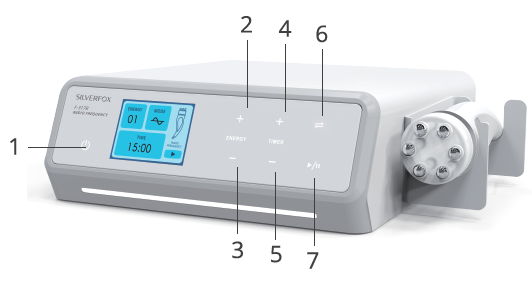 1. Zasuňte RF (radiofrekvenční) sondu do hostitelské zásuvky. Po správném připojení zařízení k napájecímu kabelu se „Vypínač napájení“ zobrazí červeně. Stisknutím „Vypínače napájení“ přejděte do provozního režimu a na obrazovce se zobrazí bíle. Zařízení je standardně nastaveno na stav nepřetržitého výstupu vln; výstupní energie úrovně 1 je tedy nastaven na 15 minut.