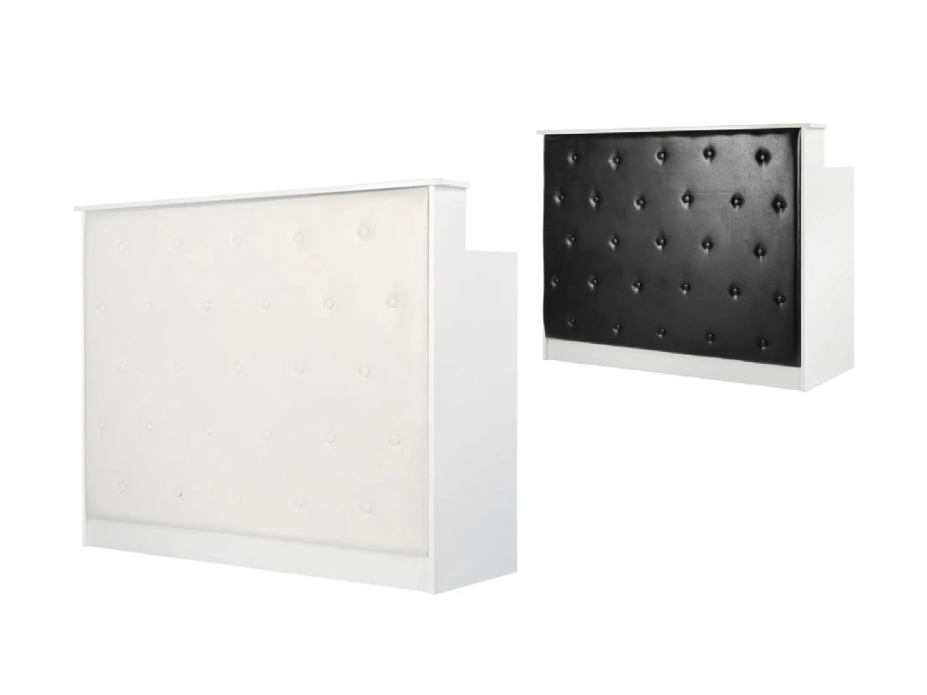 Tento kus nábytku je vyroben z vysoce kvalitní, odolné laminované lepenky v odstínech bílé a hladké povrchy nezpůsobují problémy s udržováním čistoty – pokud jsou znečištěné, stačí je otřít vlhkým hadříkem. Dekorativní přední část je čalouněna syntetickou kůží v odstínech černé, která jí dodává stylový nádech, zajišťuje odolnost nábytku a snadno se čistí. Dekorativní knoflíky dodávají eleganci a jedinečnost a zdůrazňují charakter interiéru. Recepční pult byl pečlivě vyroben, je stabilní a použité materiály umožňují mnoho let efektivního používání.