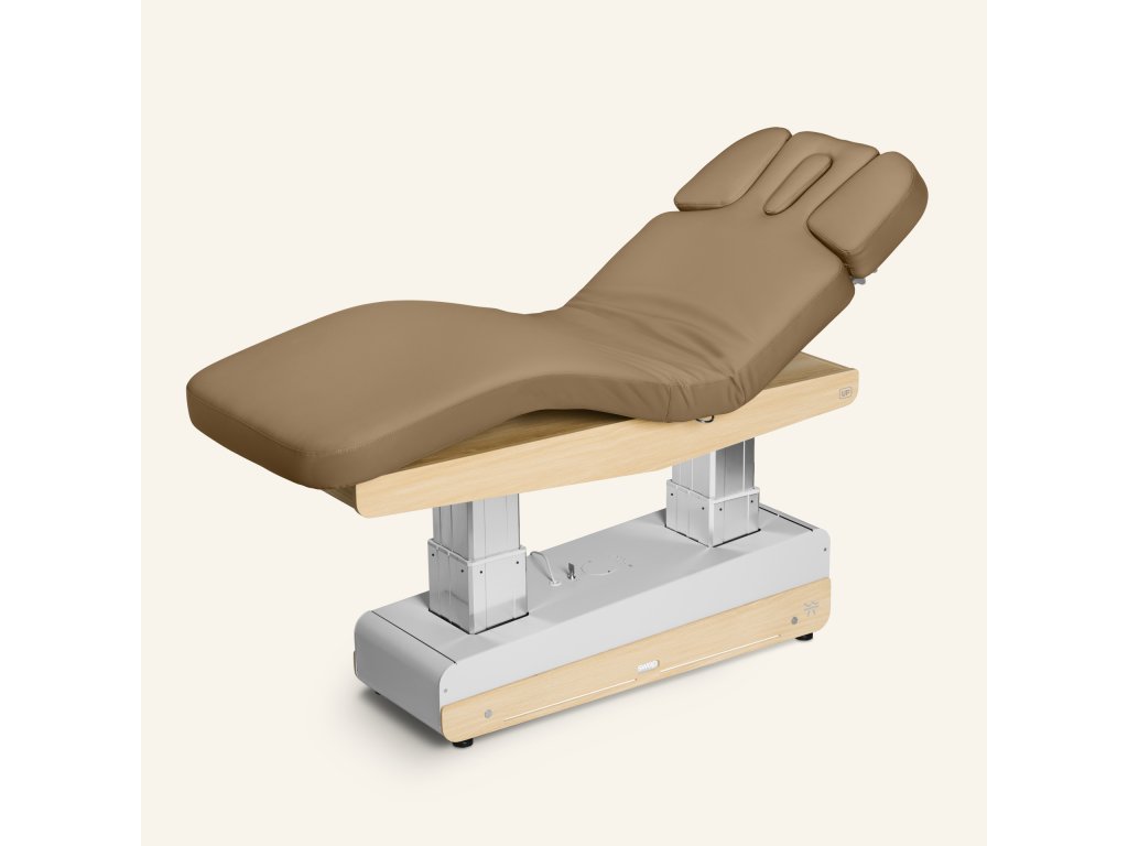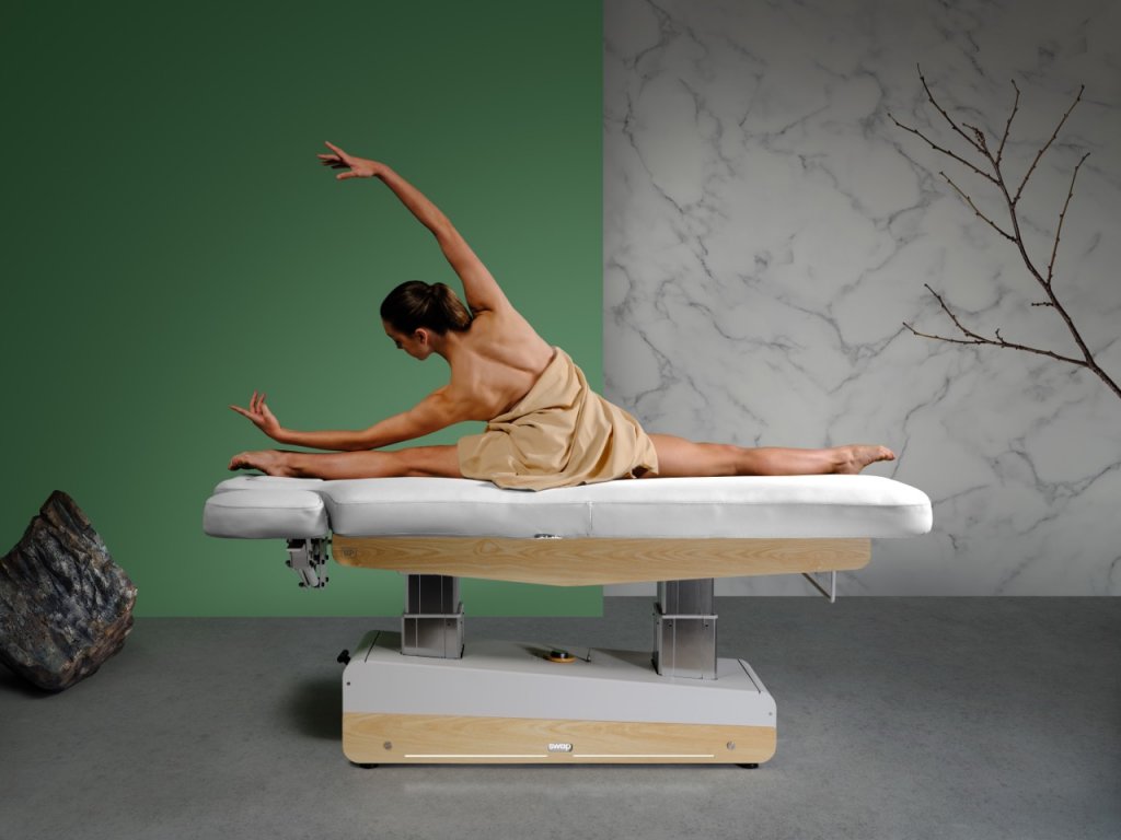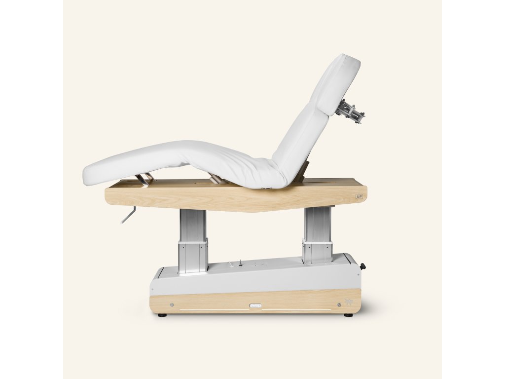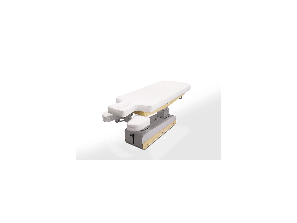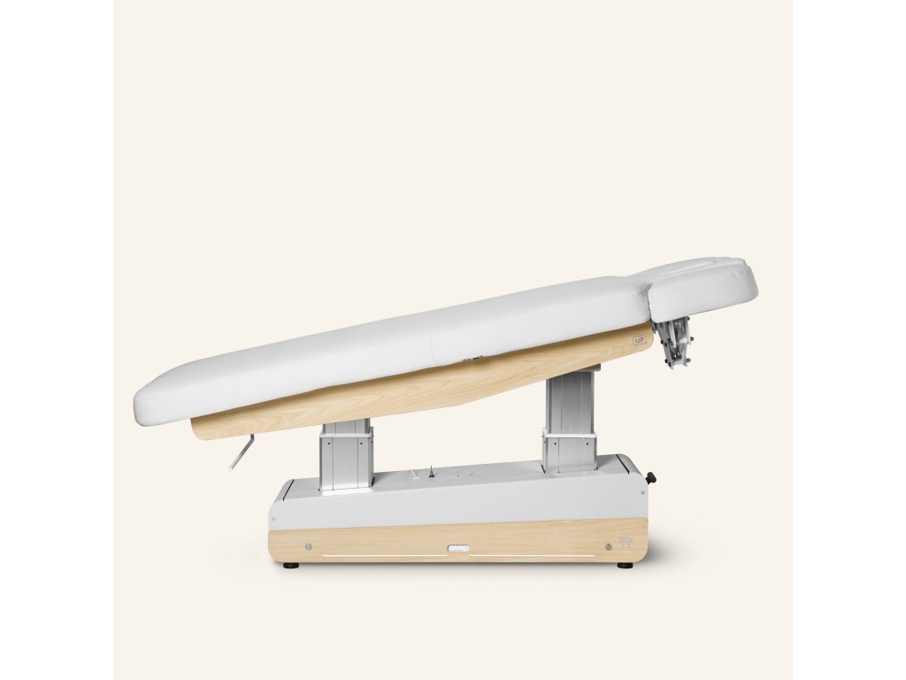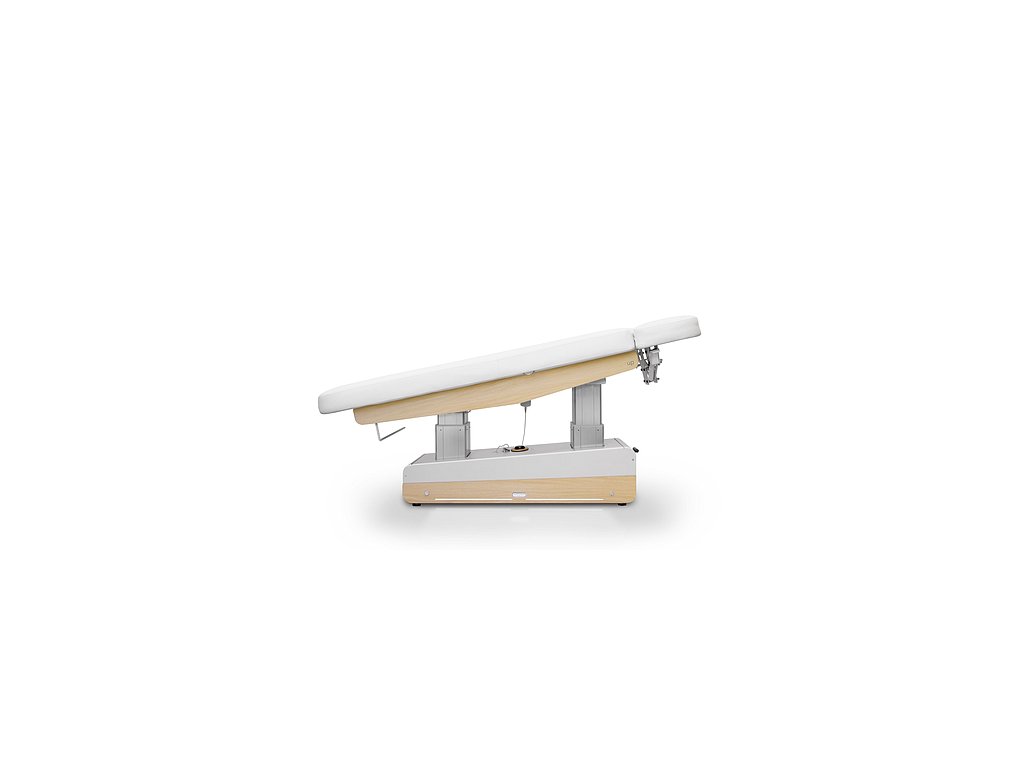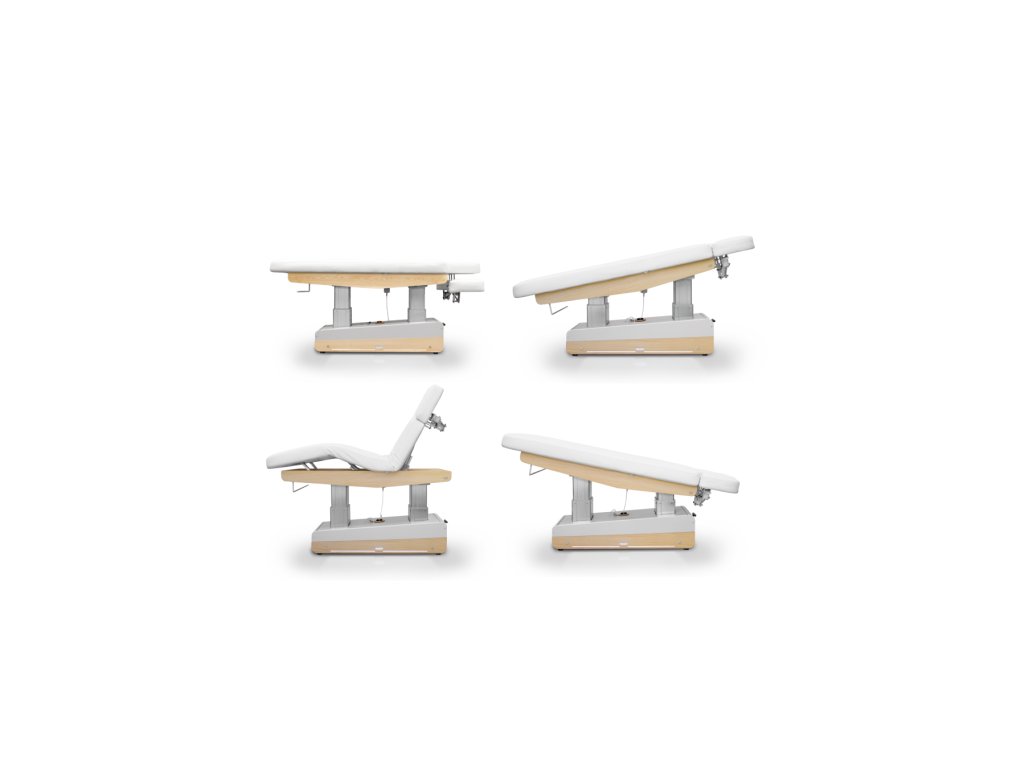 Díky dvojité sloupové základně je postel extrémně stabilní a všestranná. 4 motory umožňují dosažení více pozic, také Trendelenburg a anti-Trendelenburg. Toto lázeňské lůžko je koncipováno jako prémiové lázeňské lůžko nabízející multifunkční řešení