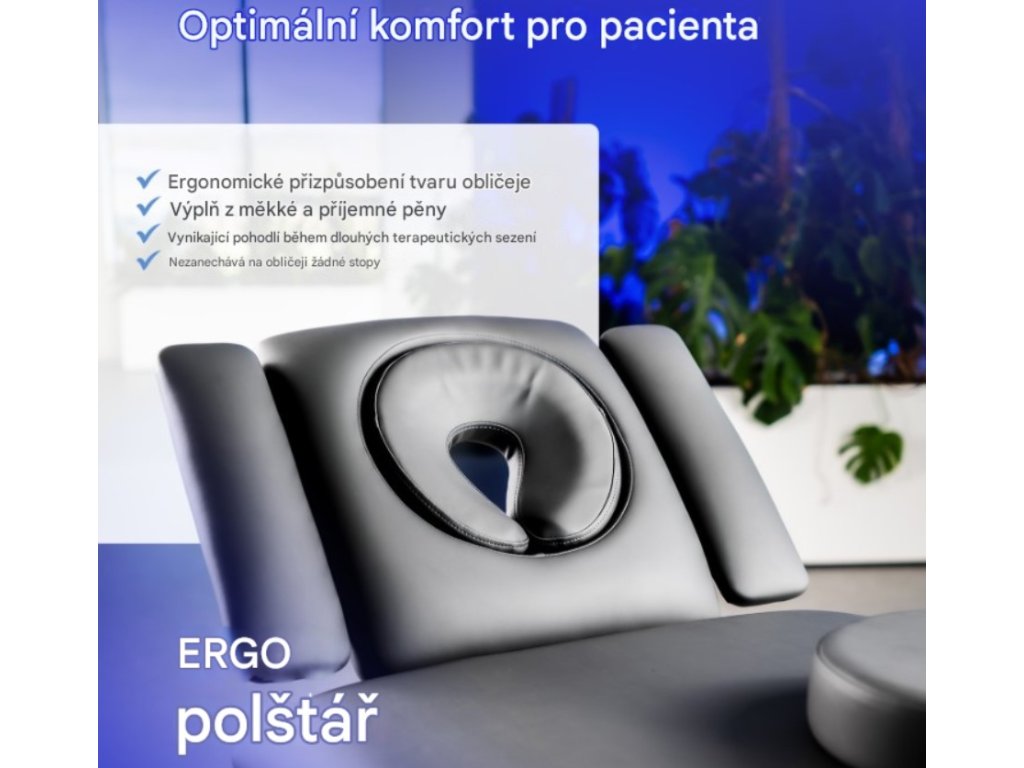 - ERGO polštář: Polštář Ergo je vhodně měkký a pohodlný, speciálně profilovaný a přizpůsobený oválu obličeje, což poskytuje pacientovi vynikající pohodlí i během dlouhé terapie nebo masáže.