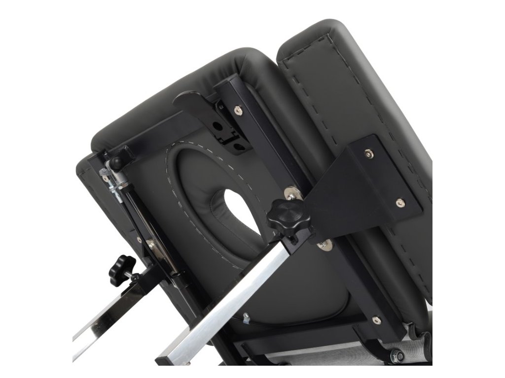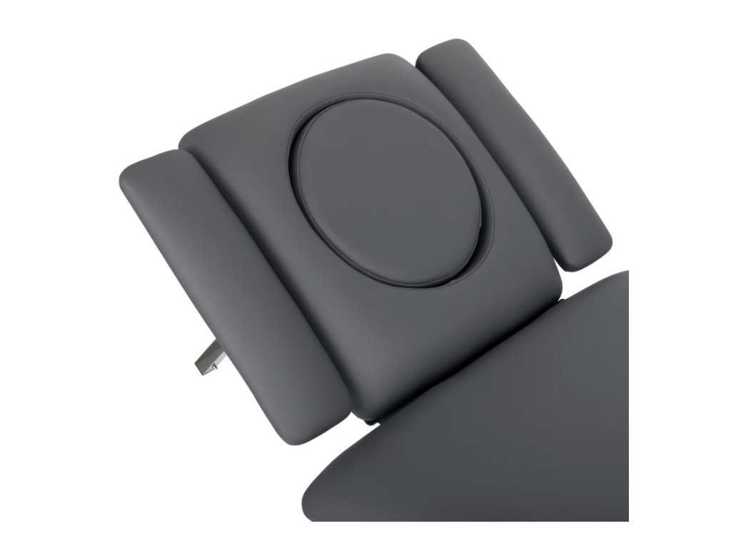 - Opěrka hlavy s otvorem na obličej a zátkou: nastavení úhlu opěrky hlavy umožňuje přizpůsobit polohu pacienta potřebám terapie. Zátka pro otvor na obličej umožňuje pohodlné ležení na zádech.