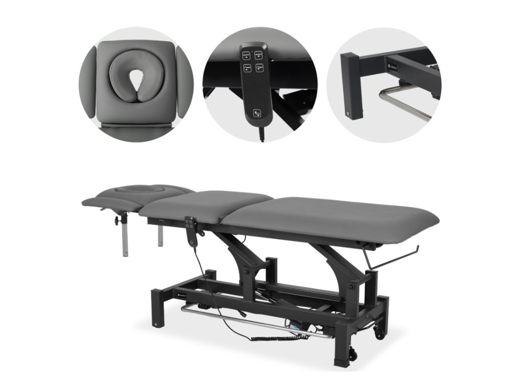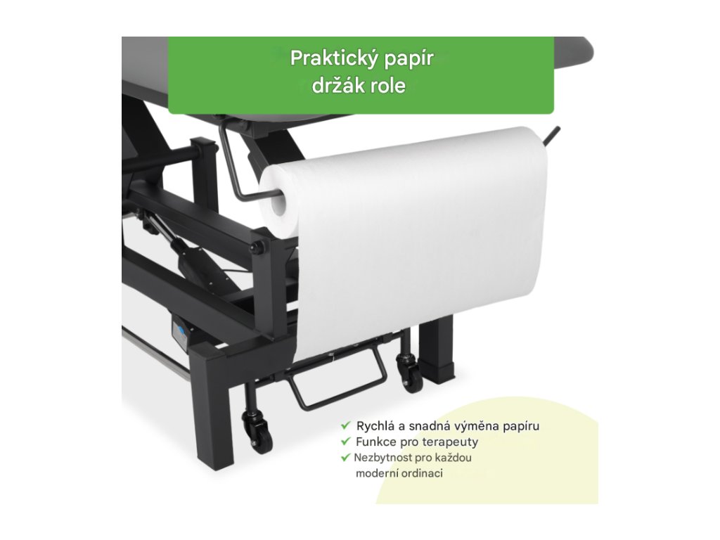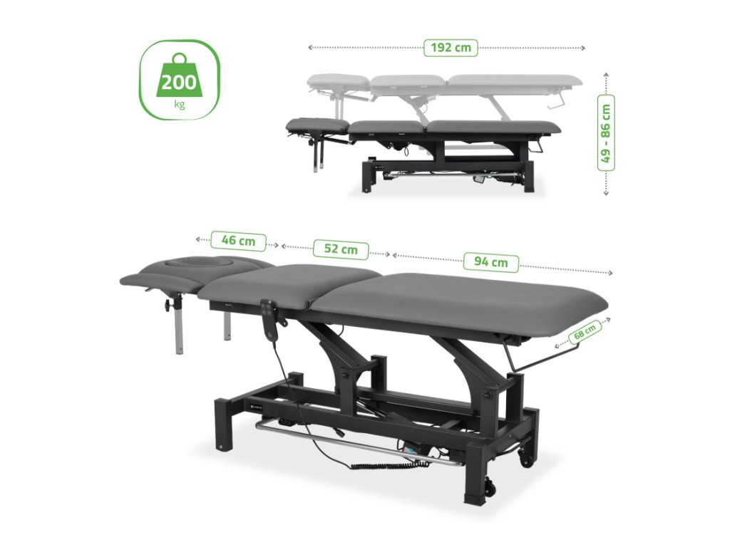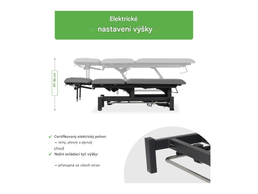 - Elektrické nastavení výšky: Vybaveno tichým, certifikovaným elektrickým pohonem, který umožňuje přesné nastavení výšky v rozsahu 49–86 cm a zajišťuje tak pohodlí terapeuta i pacienta.