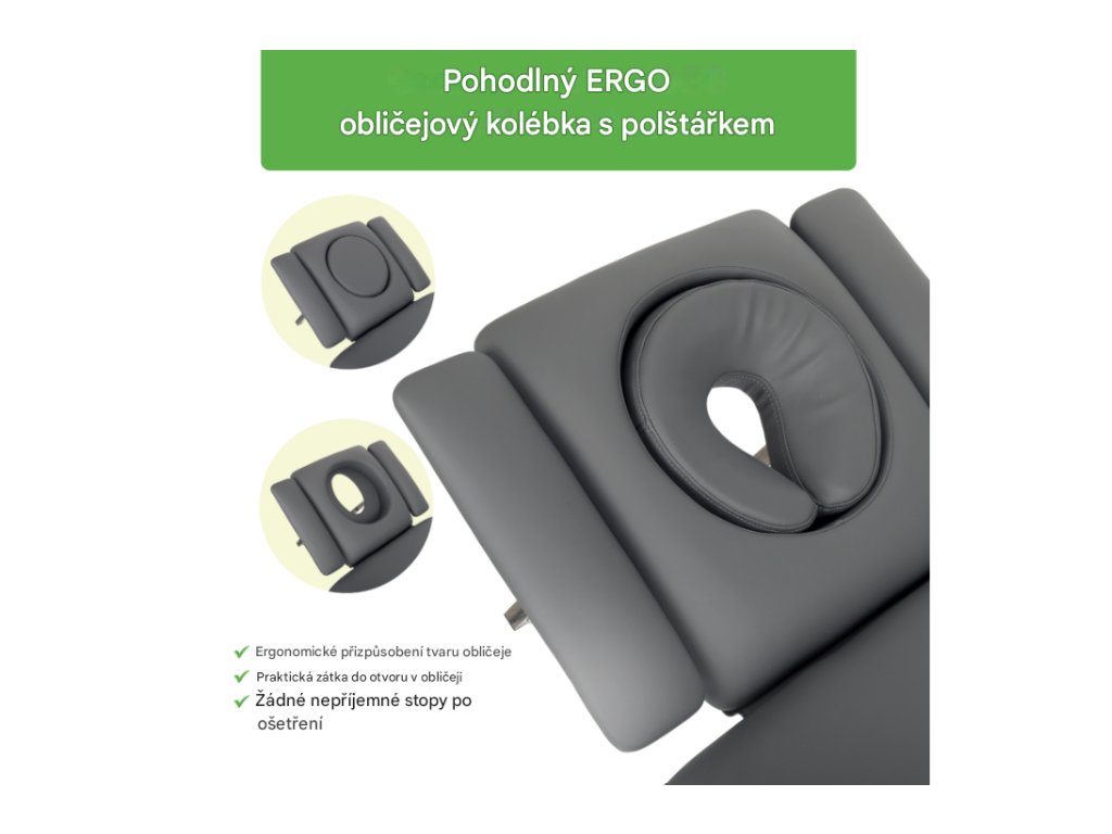 - Opěrka hlavy s ERGO polštářem: Měkký, ergonomický polštář přizpůsobený obličeji, nastavitelný pro optimální polohování během dlouhých terapií nebo masáží.