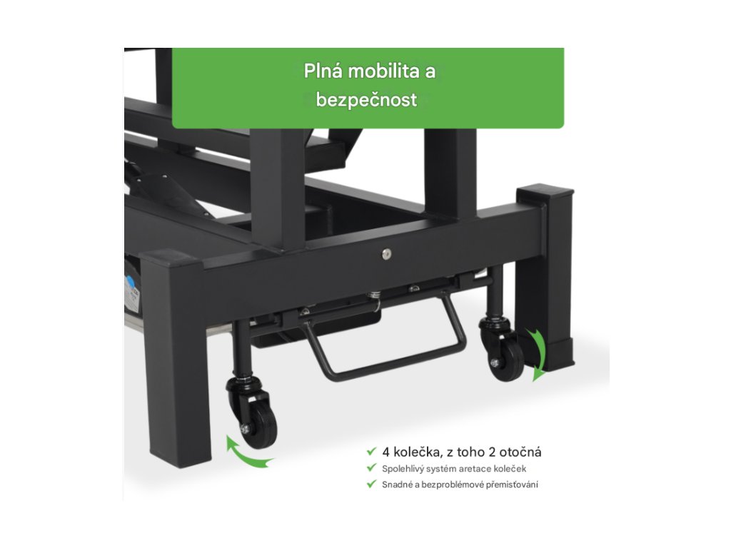 - Systém mobility s aretací: 4 kolečka, z toho 2 otočná, pro plynulý a snadný pohyb.