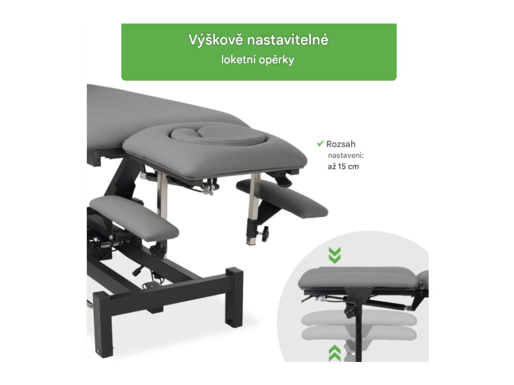 - Pohodlí a ergonomie: Polštář ERGO, nastavitelná opěrka hlavy a loketní opěrky zaručují maximální pohodlí pacienta a pohodlí terapeuta.