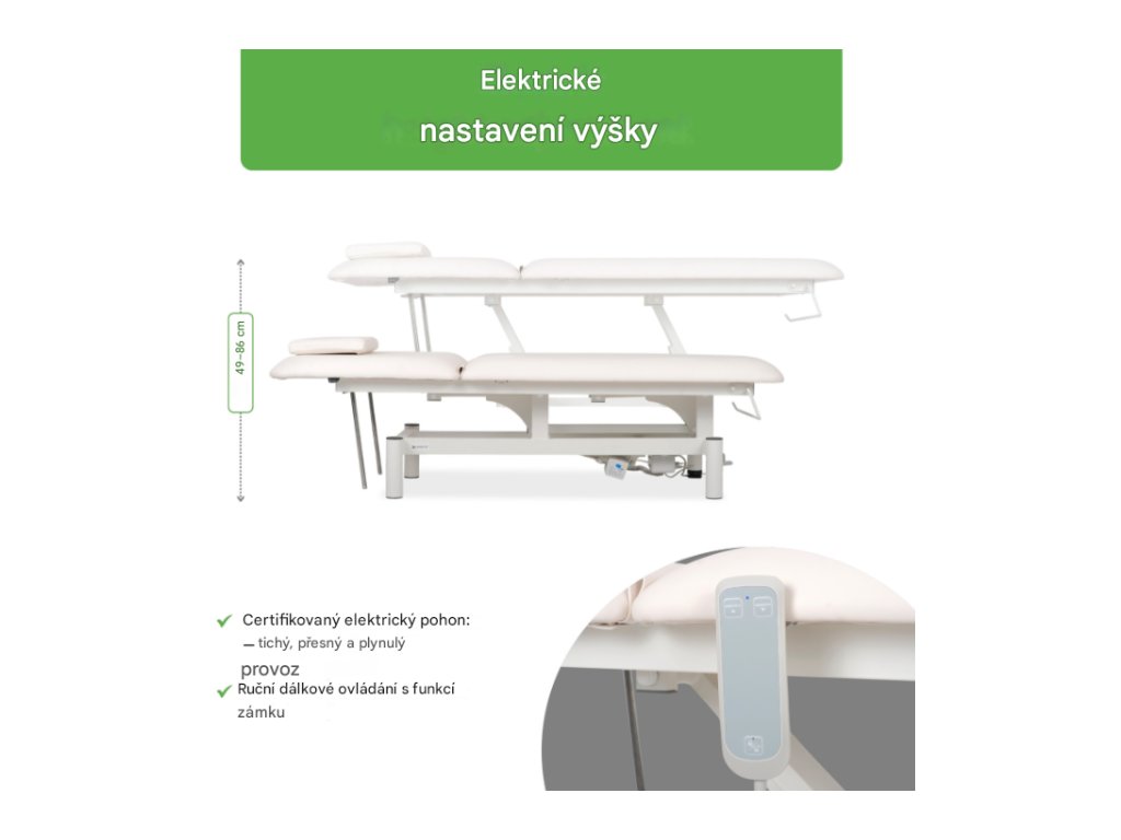 Stůl Optima je vybaven tichým, certifikovaným elektrickým pohonem, který umožňuje přesné nastavení výšky od 49 cm do 86 cm, což zajišťuje pohodlné pracovní podmínky pro terapeuta a maximální pohodlí pro pacienta. -