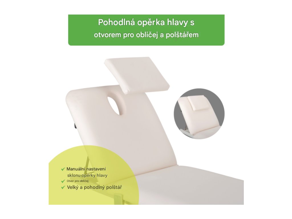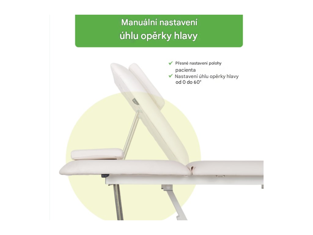 Manuální nastavení úhlu opěrky hlavy umožňuje rychlé polohování pacienta podle požadavků terapie. Otvor pro obličej umožňuje volné dýchání v poloze na břiše. V případě potřeby lze k zakrytí otvoru použít velký polštář, což zajišťuje pohodlné polohování v poloze na zádech nebo na boku. -