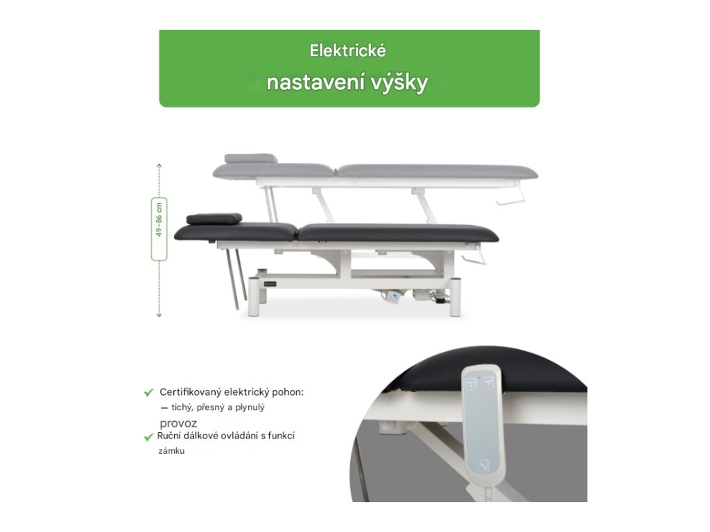 Stůl Optima je vybaven tichým, certifikovaným elektrickým pohonem, který umožňuje přesné nastavení výšky od 49 cm do 86 cm, což zajišťuje pohodlné pracovní podmínky pro terapeuta a maximální pohodlí pro pacienta. -