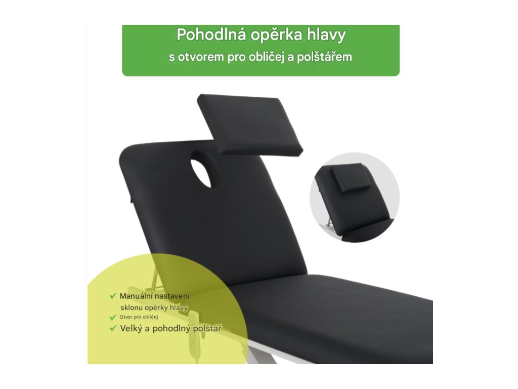 Pohodlná lehátka o rozměrech 182 × 68 cm se skládají ze dvou částí: opěrky hlavy a hlavní desky stolu. Nastavitelná opěrka hlavy umožňuje správné umístění krční páteře. -