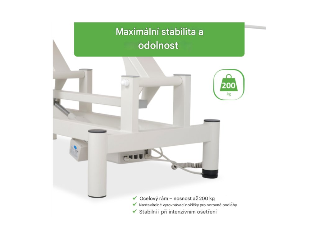 Stůl Optima byl navržen tak, aby poskytoval vynikající stabilitu a pevnost. Zesílený rám unese maximální zatížení až 200 kg, což zajišťuje bezpečnost během ošetření, a to i pro pacienty s vyšší tělesnou hmotností. -