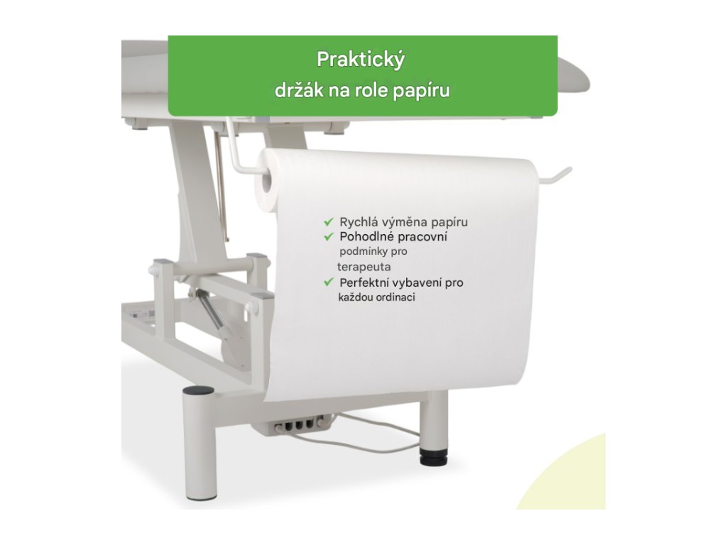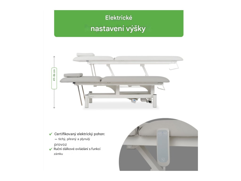 Stůl Optima je vybaven tichým, certifikovaným elektrickým pohonem, který umožňuje přesné nastavení výšky od 49 cm do 86 cm, což zajišťuje pohodlné pracovní podmínky pro terapeuta a maximální pohodlí pro pacienta. -