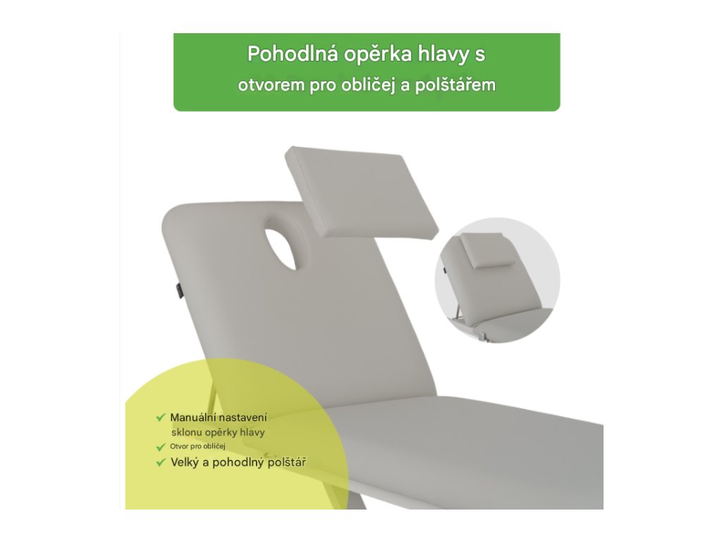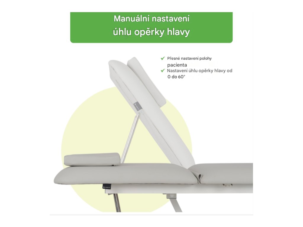 Manuální nastavení úhlu opěrky hlavy umožňuje rychlé polohování pacienta podle požadavků terapie. Otvor pro obličej umožňuje volné dýchání v poloze na břiše. V případě potřeby lze k zakrytí otvoru použít velký polštář, což zajišťuje pohodlné polohování v poloze na zádech nebo na boku. -