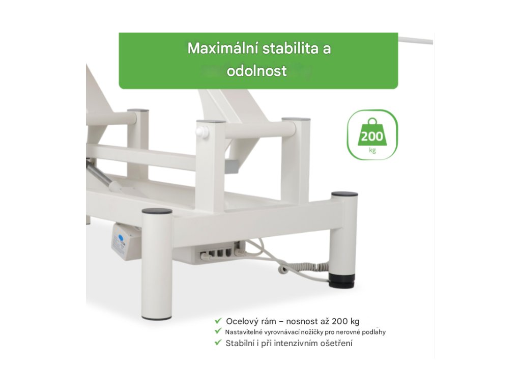 Stůl Optima byl navržen tak, aby poskytoval vynikající stabilitu a pevnost. Zesílený rám unese maximální zatížení až 200 kg, což zajišťuje bezpečnost během ošetření, a to i pro pacienty s vyšší tělesnou hmotností. -