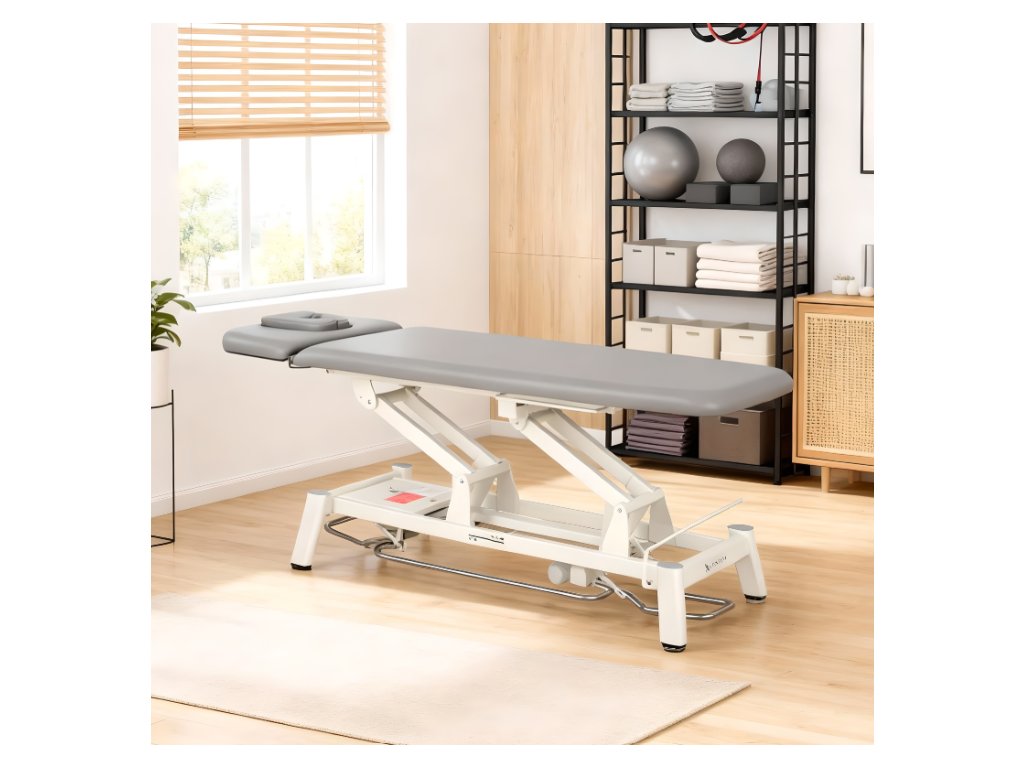 - Pohodlná dvoudílná deska stolu s nastavitelnou opěrkou hlavy: Umožňuje přesné a pohodlné polohování pacienta, čímž zvyšuje efektivitu terapeutických sezení.