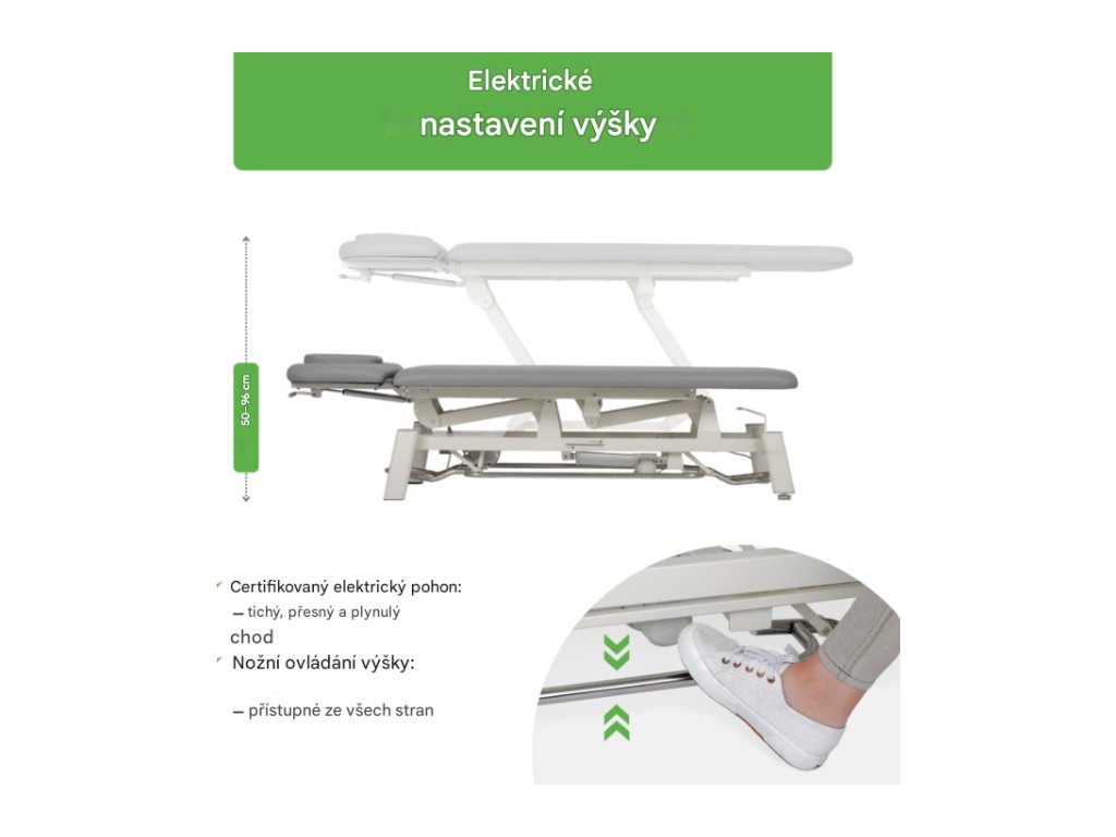 - Elektrické nastavení výšky: Certifikovaný elektrický pohon zajišťuje plynulé, přesné a tiché nastavení výšky v rozsahu 50–96 cm, což poskytuje pohodlí jak terapeutovi, tak i pacientovi. Umožňuje snadno přizpůsobit výšku stolu vaší pracovní poloze – chrání vaši páteř a zlepšuje ergonomii. Nízká poloha usnadňuje a bezpečněji pacientům nastupovat a vystupovat z terapeutického stolu.