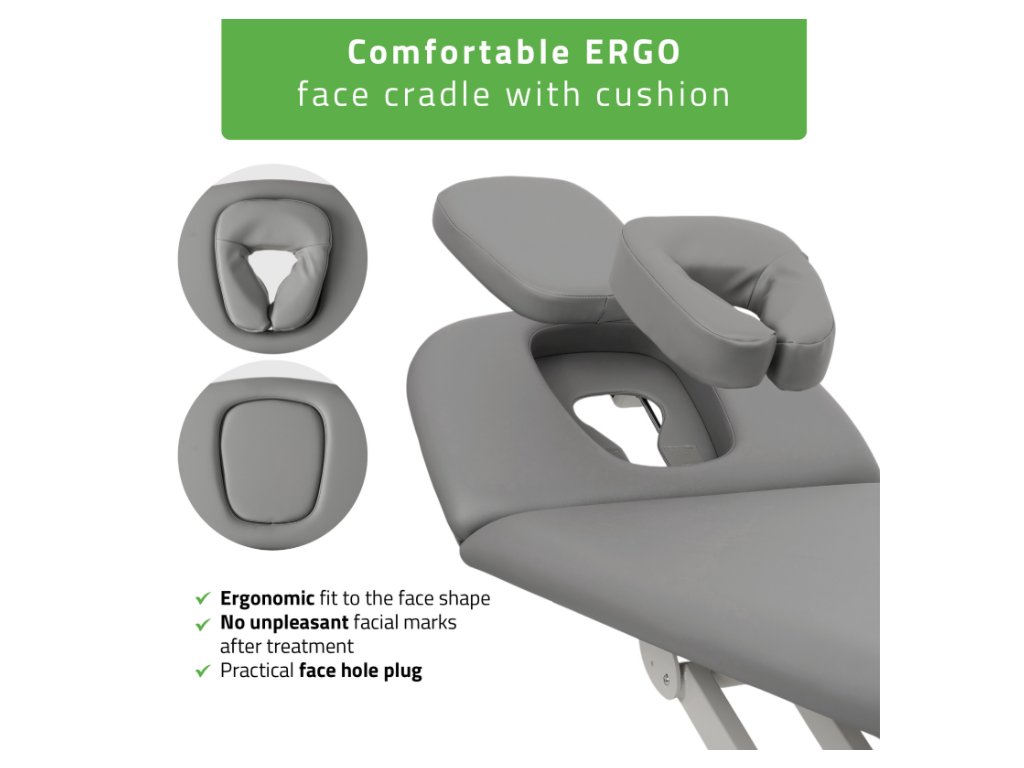 Díky dvoudílné desce stolu, elektrickému nastavení výšky a ergonomickým prvkům poskytuje tento model bezpečnost, maximální pohodlí pacienta a optimální pracovní podmínky přizpůsobené individuálním potřebám každého terapeuta.