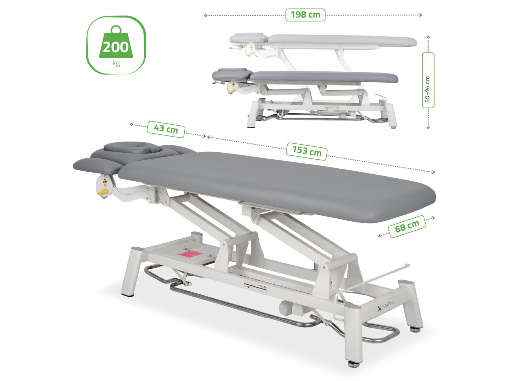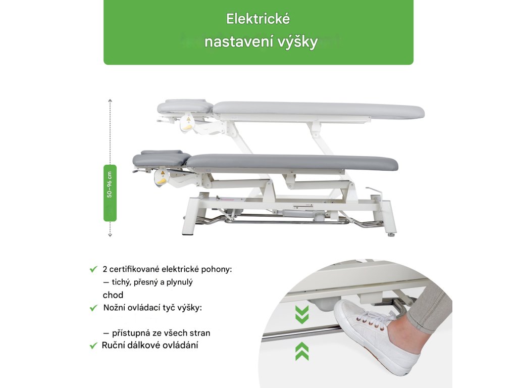 Elektrické nastavení výšky: Certifikovaný elektrický pohon zajišťuje plynulé, přesné a tiché nastavení výšky od 50 do 96 cm, což zajišťuje pohodlí terapeuta i pacienta. Nižší nastavení také usnadňuje pacientům bezpečné nastupování a slézání ze stolu.