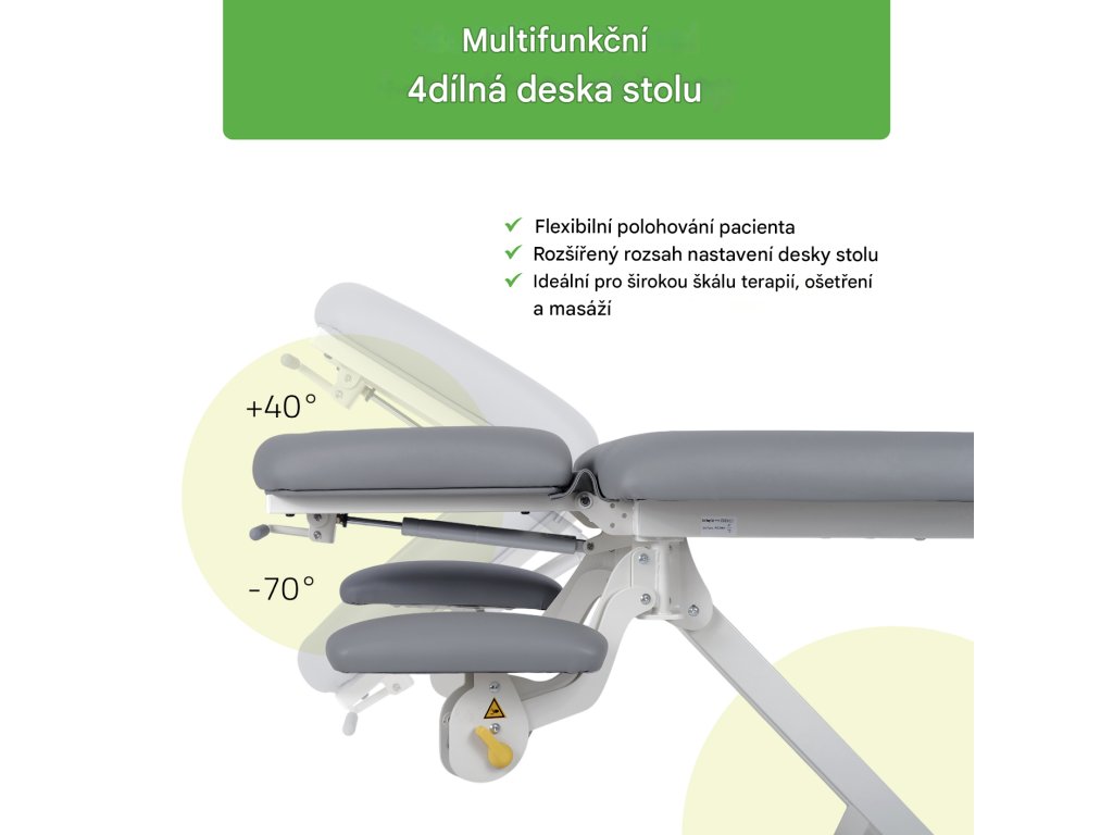 Pohodlná čtyřdílná deska stolu s nastavitelnou opěrkou hlavy a područkami: umožňuje přesné a pohodlné polohování pacienta a zvyšuje tak účinnost terapie.