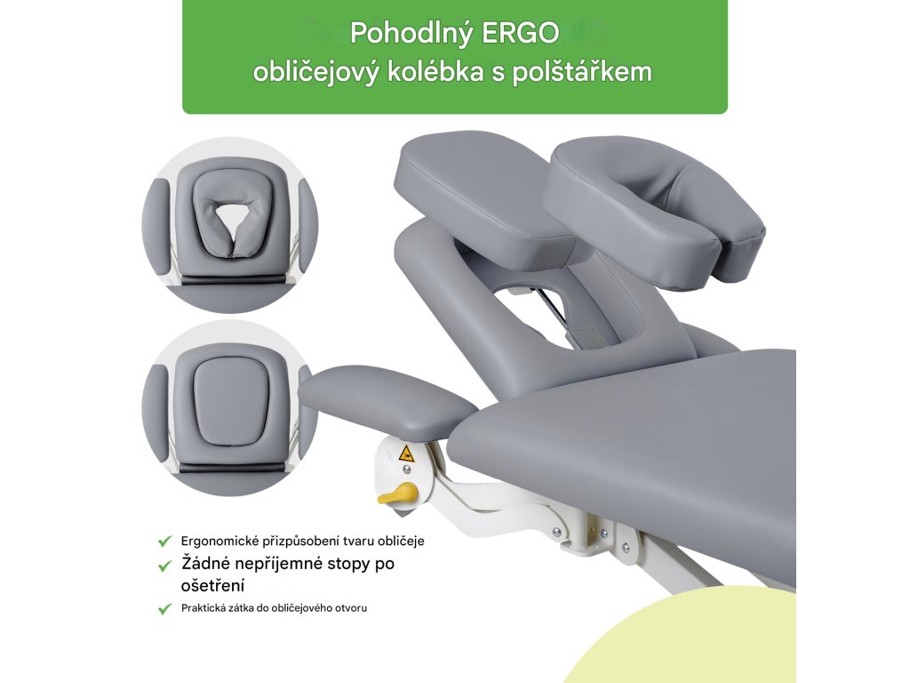 Nastavitelná opěrka hlavy s otvorem pro obličej a ERGO polštářem: zajišťuje pohodlí pacienta v poloze vleže na zádech i na břiše. Systém plynových pružin umožňuje snadné nastavení úhlu opěrky hlavy od -70° do +40°.