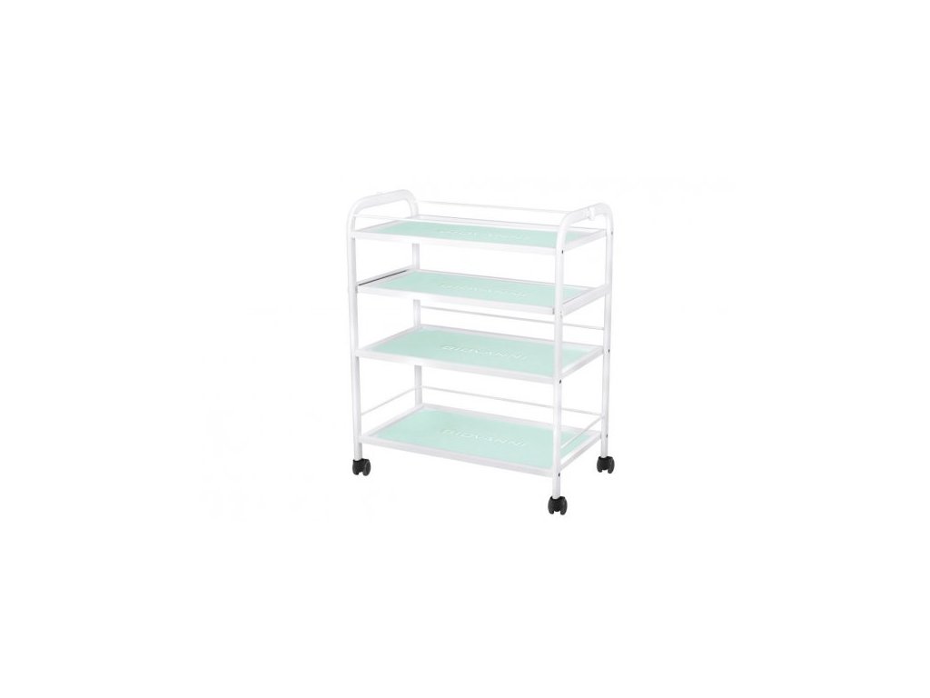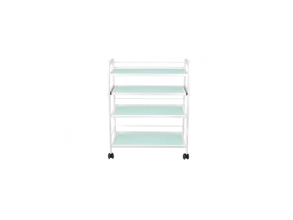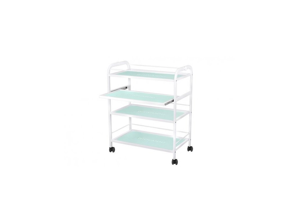 Kovově-skleněný stolek s gumovými kolečky. Tento robustní nábytek je ideální pro kosmetické nástroje. Je možné k němu připevnit lampu, lupu a další příslušenství. Stolek 1015A má 4 skleněné poličky s logem GIOVANNI. Jeho velkou předností je výsuvná police