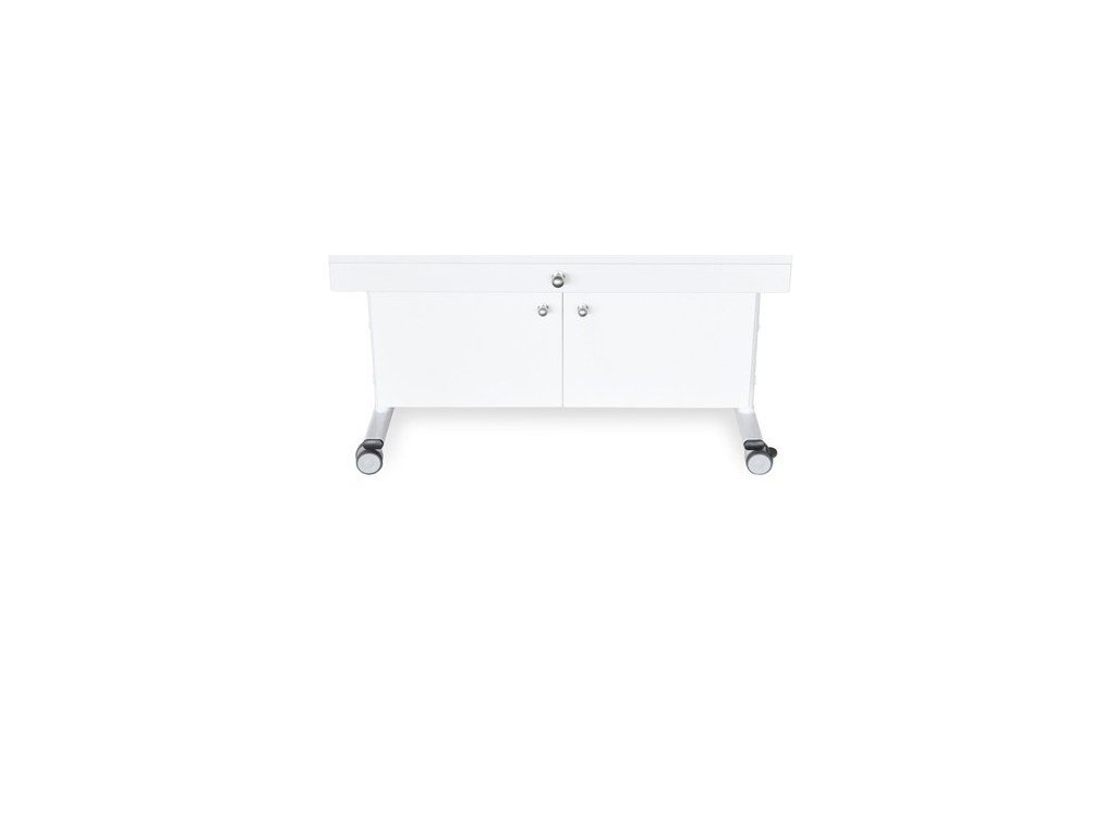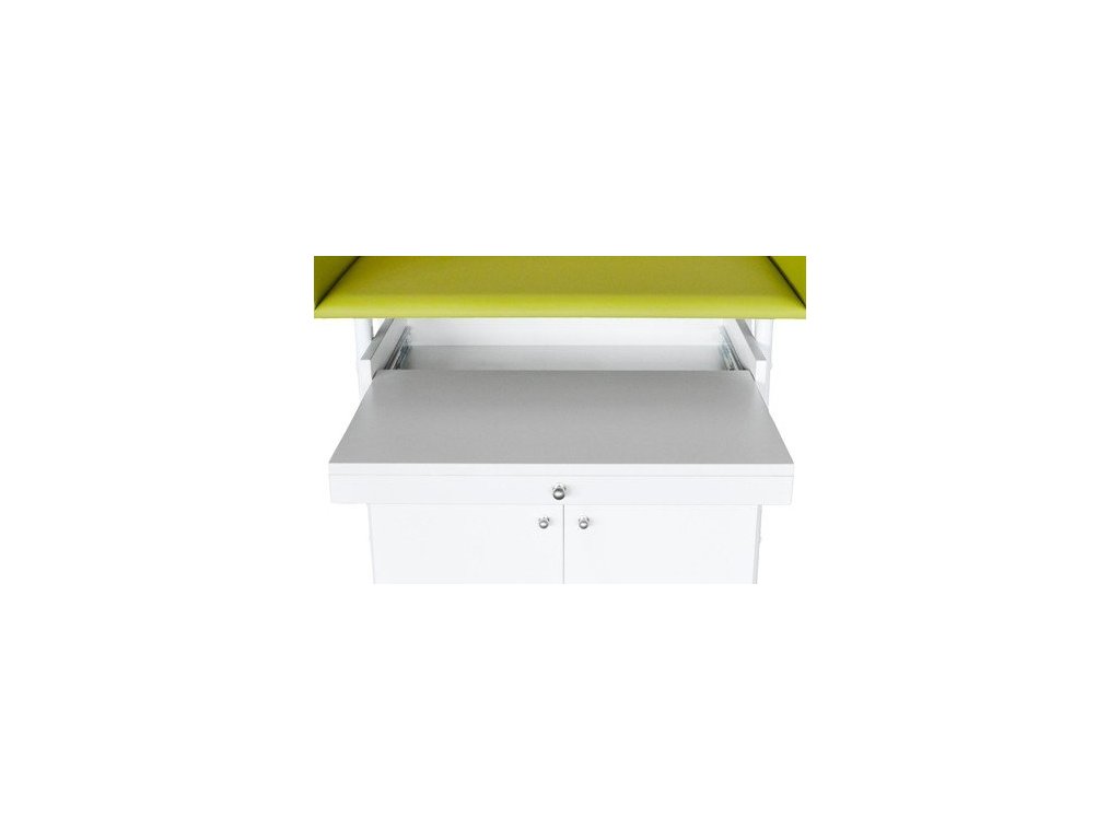 Stůl má skříňku pod deskou stolu. Doporučeno do zdravotnických zařízení, klinik a nemocnic. Ocelová konstrukce je standardně práškově lakovaná v bílé barvě.