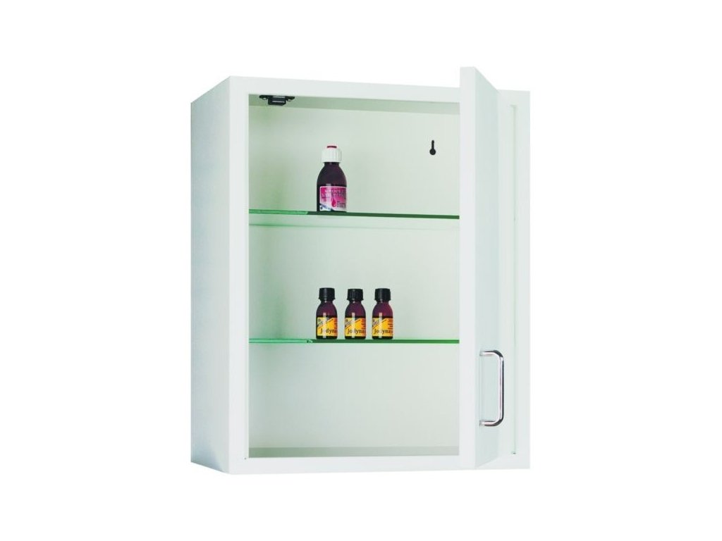 Závěsná skříňka s jedněmi dvířky s madlem a magnetickou západkou, uvnitř jsou dvě police ze skla.